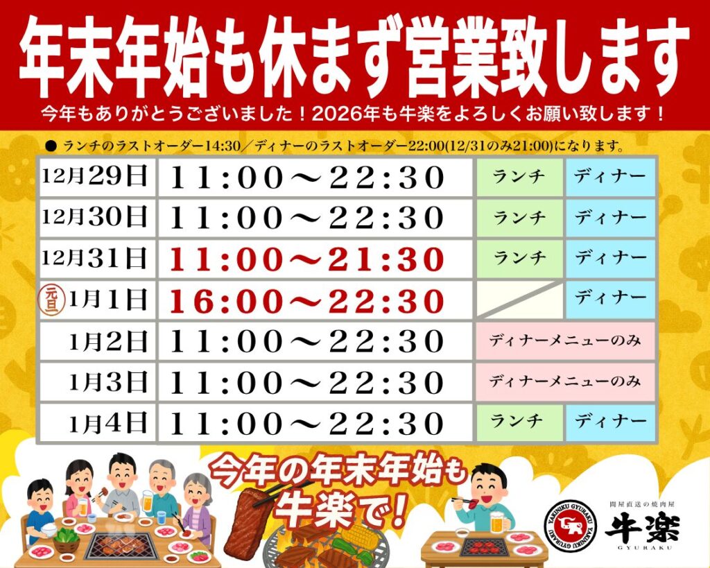 年末年始の営業時間と内容を上記画像の通り変更させて頂きます。 年末年始の営業時間 元旦はディナーのみの営業となります 1月2日と1月3日の期間はランチメニューの提供を休止させて頂きますのでご了承ください -